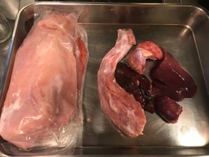 右が、レバー、ハツ、砂肝。(やっぱり焼鳥に例えますね)真ん中は首!一番左は成形されたターキー胸肉で、今回はこれも一緒に仕込みます。